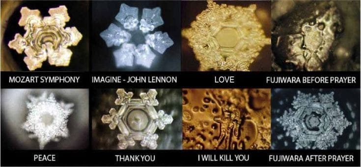 Japanese author Masaru Emoto famously photographed frozen water crystals after exposing them to different words and intentions.